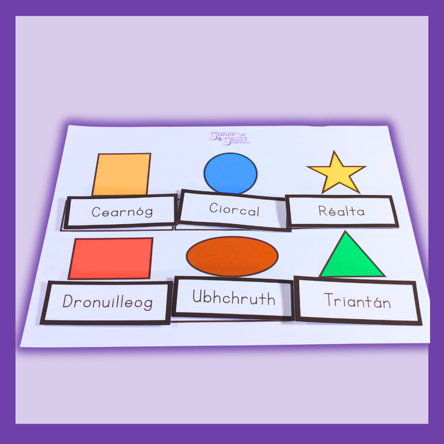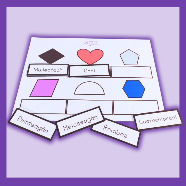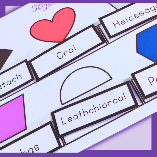 Cur le Chéile! Match Together! Read the words to younger children to help them learn new vocabulary by matching the word and sticking it under the picture of the corresponding shapes on the worksheet.