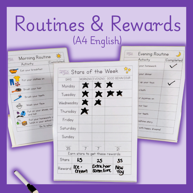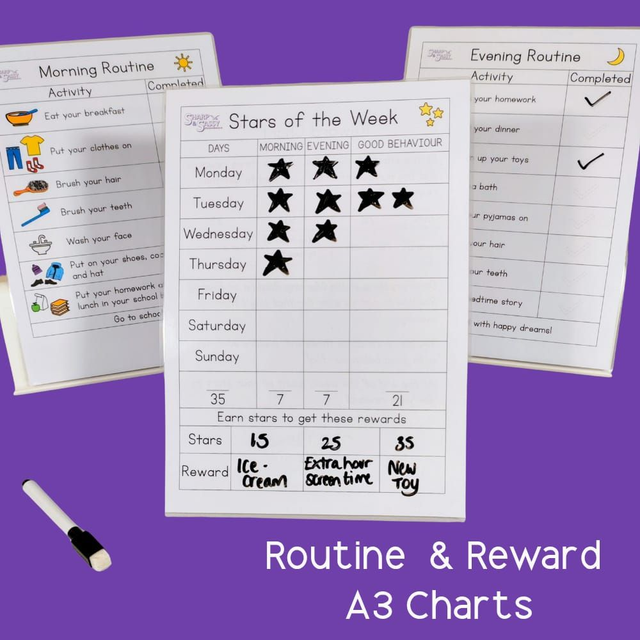 These charts will give your child positive reinforcement while developing good habits, becoming more independent and also do a little maths counting up the stars! Having the sliding scale system means that even if they don't have many stars towards the end of the week, they can still earn enough to get a small reward which will likely see their behaviour improve in the following weeks to earn bigger rewards.